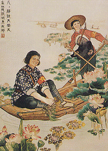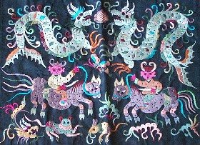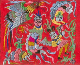 從春秋中期到戰(zhàn)國(guó)時(shí),楚國(guó)的刺繡品已遠(yuǎn)銷到西伯利亞地區(qū),可見其刺繡業(yè)之發(fā)達(dá)。南方的楚國(guó)絲織業(yè)足以代表當(dāng)時(shí)我國(guó)絲織品工藝技術(shù)的最高水平。屈原的《楚辭·招魂》為我們描繪了一幅楚宮絲織品圖畫,“翡翠珠被,爛齊光些。蒻阿拂壁,羅帳張些;纂組綺縞,結(jié)琦璜些!鋷鋷,飾高堂些”,“被文服纖,麗而不奇些!边@種需求對(duì)刺繡品的生產(chǎn)、發(fā)展的刺激是不難想見的。同時(shí),楚文化氛圍下民間戲曲的發(fā)達(dá)、巫風(fēng)巫月術(shù)的盛行又為刺繡走向民間提供了生長(zhǎng)的沃土。