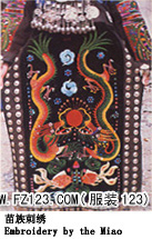 刺繡,是苗族婦女盛裝不可或缺的飾物,主要有領(lǐng)花、肩花、襟花、背塊花、袖口花、裙鑲花、帽頂花、帽頂花等品種。苗族刺繡,整體上多為幾何構(gòu)圖,古樸多姿。其圖案因繡片條、塊的不同,分為幾何二方連續(xù)式和四方連續(xù)式構(gòu)圖。其圖案取材于生活中常見的草木、鳥獸、蟲魚、器具等。圖案的整體布局一般以菱形為立體紋樣,常見的是大菱形中套小菱形,小菱形又分別由不同色彩的方、圓、三角點(diǎn)狀組成。條狀繡片,多用點(diǎn)、線或線面組合,一整二剖構(gòu)圖。繡片是按布的經(jīng)緯戳針,故曲線多折角。大塊繡片,如背塊花等,多用菱形四方連續(xù)構(gòu)圖,并在其中布以對(duì)稱的變形幾何點(diǎn)及其他折線。所有繡片,粗看五彩斑斕,細(xì)觀則不同色線組圖分明,交錯(cuò)重疊,既復(fù)雜多變又結(jié)構(gòu)嚴(yán)謹(jǐn)、條理清晰。繡法很多,有平繡、凸繡、辮繡、堆花、縐繡、纏繡、挑繡、抽花等。平繡是最曾遍的繡法。這種繡法是重于圖案布局的美觀勻稱,色調(diào)鮮明,有明顯的物象感。凸繡流行于凱里、臺(tái)江部分地區(qū),它是在底布上多鋪幾層紙花,使所繡圖案凸出,有立體感。辮繡只在雷公山巴拉河一帶流行,其方法是將若干根色線編成辮子,按設(shè)計(jì)圖案平鋪于底布上,用絲線釘牢即成。圖案色調(diào)大致是青年女子鮮艷,中年以上婦女稍渾暗。如凱里、黃平、施秉等地,姑娘及較年輕婦女的盛裝刺繡以青布作底,繡大紅,間有少量白黃綠之色,亮麗醒目;中年以上婦女盛裝刺繡,亦以青布作底,以紫藍(lán)為基調(diào),間以少許桔紅、綠、白等色,顯得深沉穩(wěn)重。
