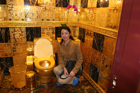 在2002年版的《吉尼斯世界紀(jì)錄》上有著這樣一條記錄:“用錢(qián)沖洗――世界上最昂貴的衛(wèi)生間由珠寶商林世榮制造,在他的中國(guó)香港商店售價(jià)240萬(wàn)英鎊。它完全由金子和昂貴的珠寶制成。抽水馬桶、洗臉臺(tái)、刷子、衛(wèi)生紙盒、鏡框、墻上架設(shè)的吊燈、墻上的瓷磚和門(mén)全部都由24K黃金構(gòu)成!