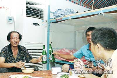 記者走進(jìn)一間宿舍,頓時感受到了空調(diào)吹出的絲絲涼氣,顯示溫度為26℃。工人們正在喝啤酒吃晚餐,因?yàn)闆隹,沒有一個打赤膊的。大伙笑著說:往年一到夏天總為睡覺發(fā)愁,太熱了睡不好,白天做事自然沒精神,今年用上空調(diào)后,日夜心里都蠻爽。