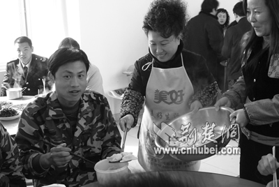 “小伙子,辛苦了,多吃點(diǎn),社區(qū)就是你們的家!”昨天中午,江岸區(qū)花橋街大江園社區(qū)的100多名外來(lái)農(nóng)民工成了社區(qū)的座上賓。社區(qū)群干自己出資,自己買菜下廚,做了12桌團(tuán)圓宴。