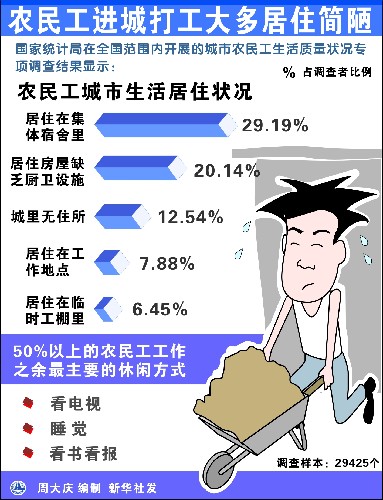 農(nóng)民工在城市打工,大多居住在簡陋的宿舍里。據(jù)調(diào)查,有29.19%的農(nóng)民工居住在集體宿舍里,有20.14%的農(nóng)民工居住在缺乏廚衛(wèi)設(shè)施的房間里,有7.88%的農(nóng)民工居住在工作地點(diǎn),有6.45%的農(nóng)民居住在臨時搭建的工棚里,還有12.54%的農(nóng)民工在城里沒有住所,只能往返于城郊之間,或回農(nóng)村居住。