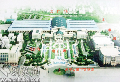 漢口火車站將建設南北兩個廣場。面積分別為9.24公頃、3公頃。配套道路包括,打通車站東側(cè)金墩路,下穿鐵路線后連通北廣場,向北延伸至常青一路、紅旗渠路等;發(fā)展大道改為下穿隧道;西側(cè)建設下穿鐵路的銀墩路,連通北廣場。站前廣場西側(cè)布置地鐵2號線漢口火車站站,以及公交樞紐站等。據(jù)估算,整個市政配套工程總投資約14億元,計劃2008年6月完成。