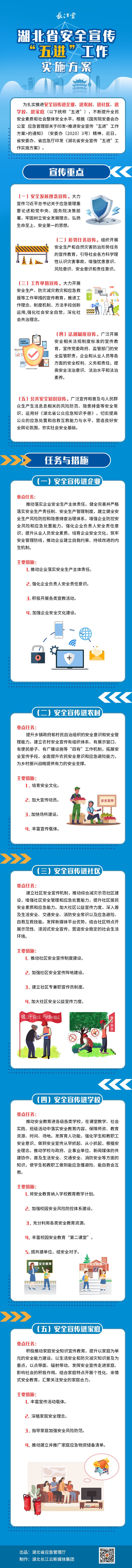 為扎實(shí)推進(jìn)安全宣傳進(jìn)企業(yè)、進(jìn)農(nóng)村、進(jìn)社區(qū)、進(jìn)學(xué)校、進(jìn)家庭(以下統(tǒng)稱“五進(jìn)”),不斷提升全民安全素質(zhì)和社會(huì)整體安全水平,近日,省安全生產(chǎn)委員會(huì)辦公室、省應(yīng)急管理廳聯(lián)合印發(fā)《湖北省安全宣傳“五進(jìn)”工作實(shí)施方案》,對(duì)我省安全宣傳“五進(jìn)”工作作出詳細(xì)部署。