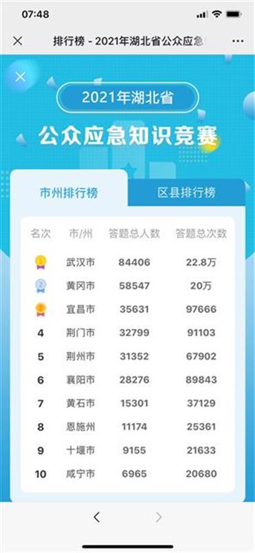 目前,武漢市、黃岡市、宜昌市答題總人數(shù)位居市州前三名,硚口區(qū)、棗陽市、松滋市位居區(qū)縣排行榜前三甲,活動還將持續(xù)至5月12日。(通訊員 陳仁海 )