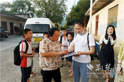 9月2日17時47分,崇陽縣天城鎮(zhèn)鹿門鋪村9組村民黃燕保站在家門口等待乘坐校車的侄兒、侄女。