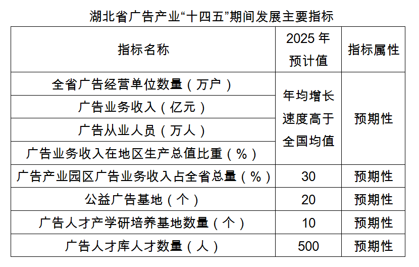 到2025年,預(yù)期全省廣告經(jīng)營(yíng)單位、業(yè)務(wù)收入、從業(yè)人員數(shù)量等關(guān)鍵性指標(biāo)年均增長(zhǎng)速度高于全國(guó),廣告業(yè)務(wù)收入在地區(qū)生產(chǎn)總值中的比重超過(guò)全國(guó)均值,廣告產(chǎn)業(yè)園區(qū)廣告業(yè)務(wù)收入等關(guān)鍵性指標(biāo)達(dá)到全省總量30%以上,建設(shè)公益廣告基地20個(gè),廣告人才產(chǎn)學(xué)研培養(yǎng)基地 10個(gè),全省廣告人才庫(kù)人才達(dá)到500人。