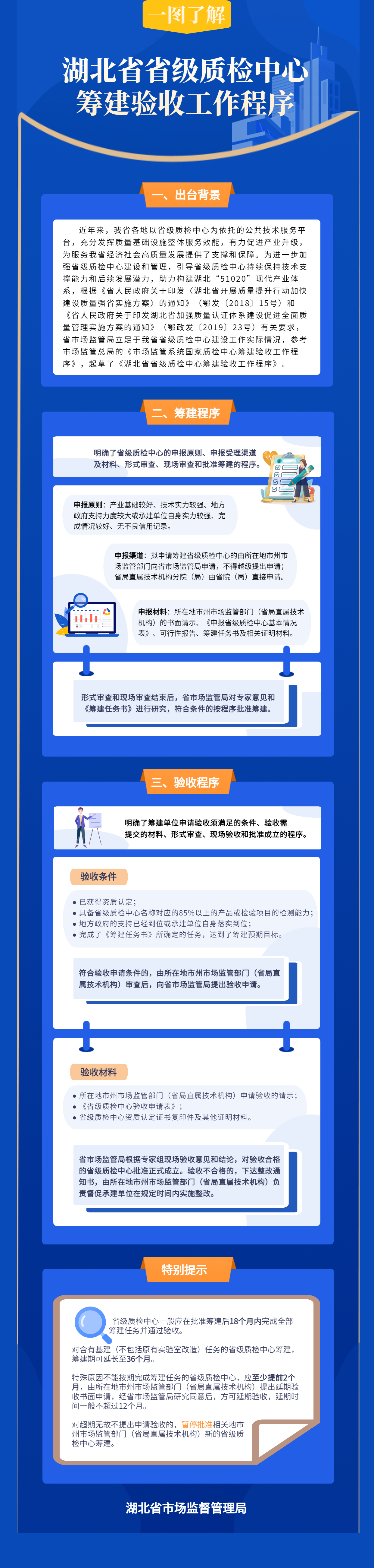為進一步加強省級質(zhì)檢中心建設和管理,引導省級質(zhì)檢中心持續(xù)保持技術(shù)支撐能力和后續(xù)發(fā)展?jié)摿?,助力?gòu)建湖北“51020”現(xiàn)代產(chǎn)業(yè)體系,近日,湖北省市場監(jiān)管局立足于我省省級質(zhì)檢中心建設工作實際情況,起草了《湖北省省級質(zhì)檢中心籌建驗收工作程序》。