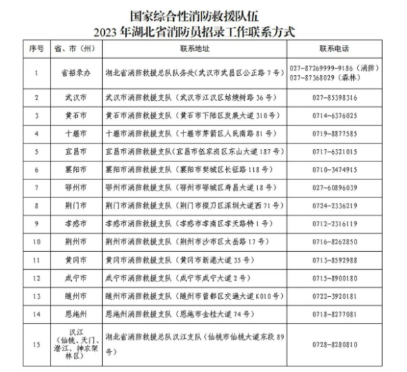 據(jù)湖北省消防救援總隊近日消息,國家綜合性消防救援隊伍2023年面向社會招錄消防員的計劃出爐,此次國家綜合性消防救援隊伍共招錄消防員15000名(女性35名),其中湖北招錄860人,網(wǎng)上報名截止時間為8月10日18時。