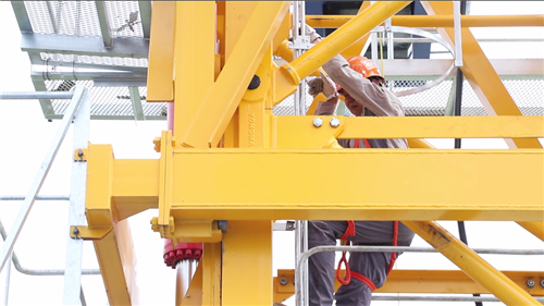 檢驗(yàn)現(xiàn)場,檢驗(yàn)員們?nèi)蔽溲b,戴上安全帽,系好安全繩,沿著狹窄的爬梯,往塔吊頂端攀爬著。在檢驗(yàn)過程中,檢驗(yàn)員嚴(yán)格按照《起重機(jī)械定期檢驗(yàn)規(guī)則》要求,依次開展了技術(shù)資料審查、作業(yè)環(huán)境和外觀檢查、金屬結(jié)構(gòu)檢查、主要零部件檢驗(yàn)、安全保護(hù)和防護(hù)裝置檢查、液壓系統(tǒng)檢查、司機(jī)室檢查、電氣檢查、性能試驗(yàn)等項(xiàng)目的檢驗(yàn)工作。整個(gè)塔吊的檢驗(yàn)歷經(jīng)了2個(gè)多小時(shí)。
