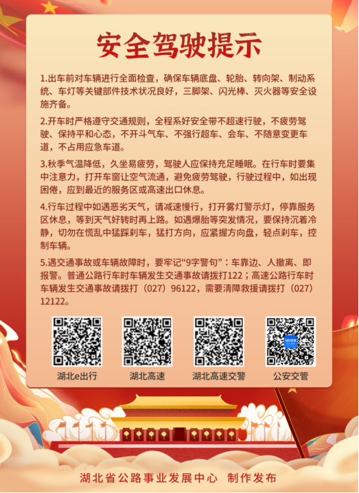 湖北省公路事業(yè)發(fā)展中心提示:建議公眾提前使用導(dǎo)航軟件規(guī)劃路線,同時(shí)通過“湖北公路”微信、“湖北高速”微博、“湖北e出行”微信公眾號、027-12122湖北高速服務(wù)熱線、中國交通廣播湖北頻率FM94.8、楚天交通廣播FM92.7等媒體平臺及時(shí)掌握了解實(shí)時(shí)路況,綜合考慮高速公路和普通國省干線公路通行情況,合理安排出行線路,盡量避開易擁堵路段。
