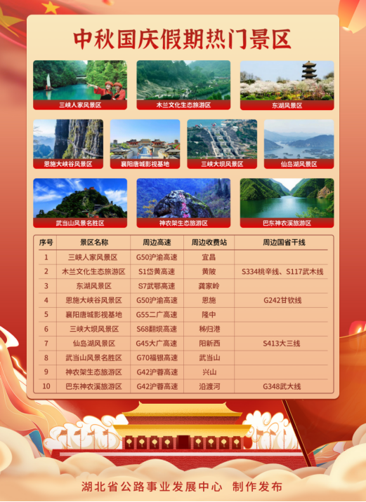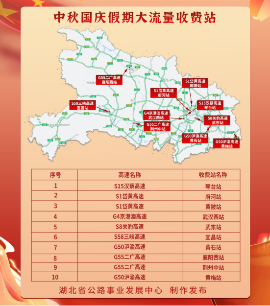 根據(jù)湖北省公路事業(yè)發(fā)展中心對近年來全省公路網(wǎng)運(yùn)行監(jiān)測數(shù)據(jù)分析,9月28日、29日出行車流主要由城市向周邊縣市、景區(qū)擴(kuò)散,10月5日、6日返程車流向城市匯集。