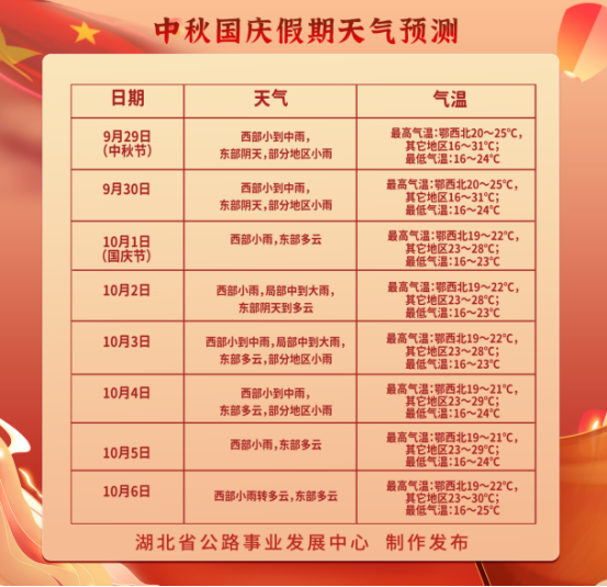 經(jīng)氣象部門研判,預(yù)計(jì)2023年中秋國慶期間(9月29日至10月6日),湖北省有兩次降水及弱降溫過程,分別出現(xiàn)在9月29—30日及10月2—4日,其它時(shí)段西部以陰雨為主,東部以多云為主;10月6日早晨部分路段可能有大霧。鑒于西部地區(qū)前期降水偏多,中秋國慶假期仍以陰雨為主,西部地區(qū)需加強(qiáng)防范邊坡滑坡等地質(zhì)災(zāi)害及降雨造成的低能見度對交通安全的影響,東部地區(qū)需關(guān)注6日早晨可能出現(xiàn)大霧天氣。具體預(yù)報(bào)如下: