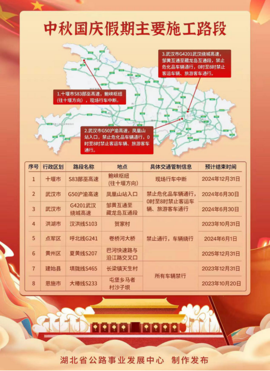 中秋國慶期間,全省公路網(wǎng)主干線有8處施工點(diǎn),主要集中在武漢、十堰、荊州、宜昌、黃岡、恩施等地,具體如下圖所示: