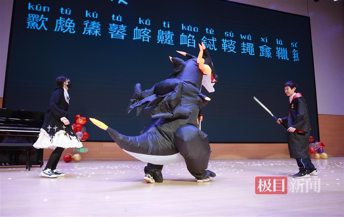 704班學生演了一出《達拉崩吧》話劇,騎士、公主、國王、恐龍、馬的服裝是他們定的,炫酷搞笑的視頻布景也是他們做的。“我從小玩編程,這個還好啦,演恐龍的寇樂芊也有幫我剪視頻?!逼渲猩砑鎸а荨⑽杳涝O計、騎士扮演者三職的劉致銘說?!拔野嗪⒆友荨妒刈o之光》小品,就找劇本我?guī)土它c忙,其他都是他們自己安排。上周五全校彩排我第一次看完全劇,發(fā)現(xiàn)他們好有創(chuàng)意,好會演?!?05班班主任徐怡楠驕傲地說,每次活動都發(fā)現(xiàn)許多學生的閃光點,正如“走過冬天”藝術節(jié)的slogan(口號)所說,在活動中,青春多了一份厚實,人生多了一份財富。