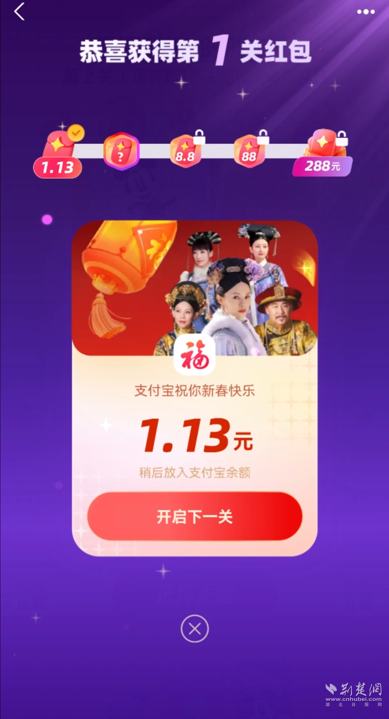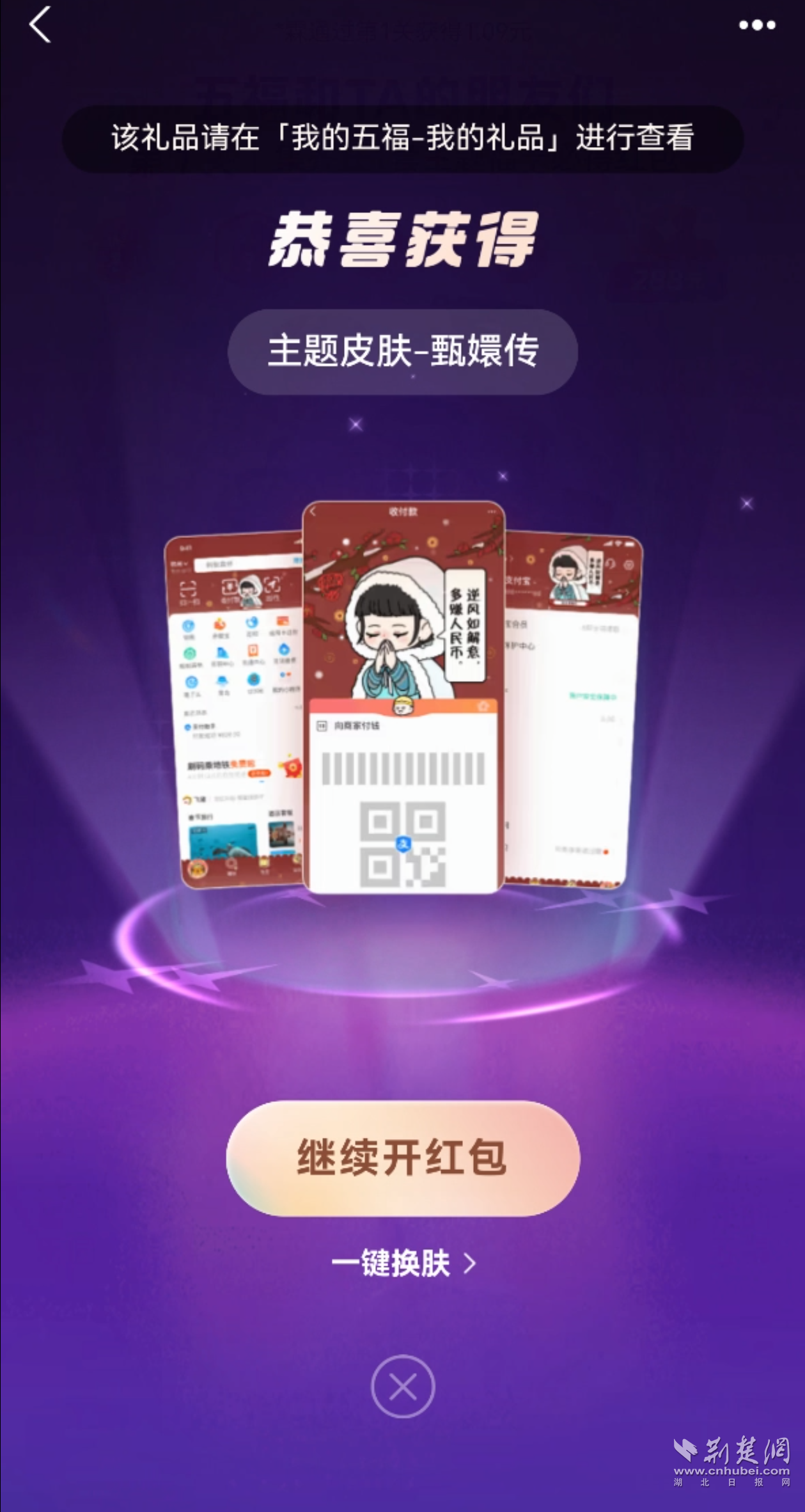 記者大約掃了六七次,就輕松集齊4張卡,合成后獲得了“甄嬛傳”主題的支付寶app的皮膚,領取紅包“開啟下一關”,則可以繼續(xù)闖關合成開獎。開獎不用等到除夕,并且可以一直集福到大年初五,這也是今年集福最大的變化之一。