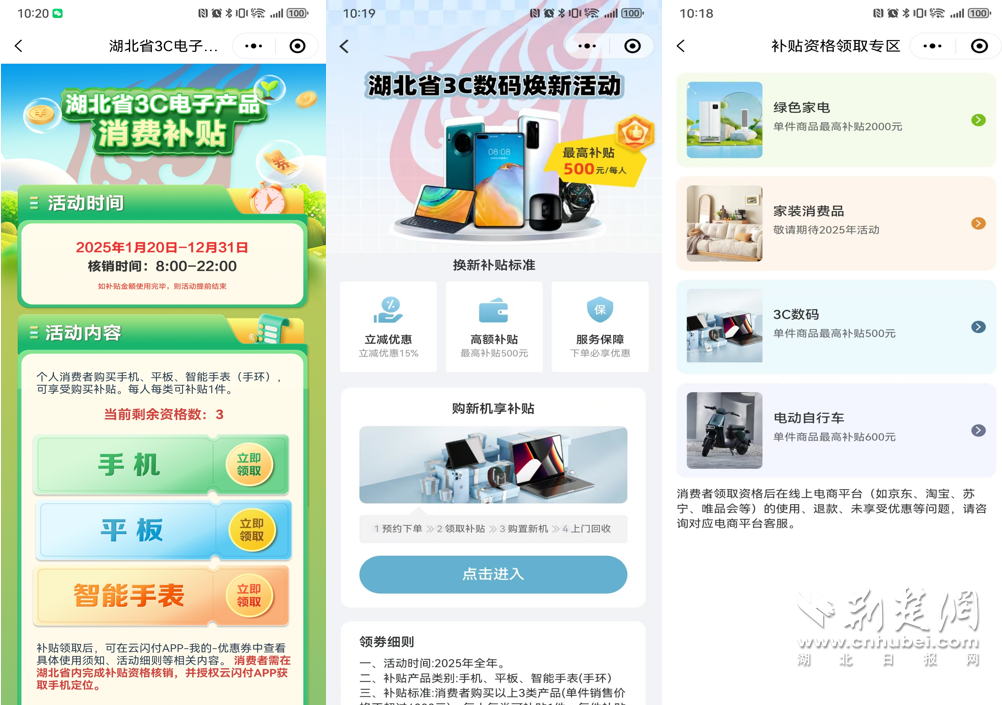 2、 選擇【3C數(shù)碼】,根據(jù)支付習慣領取補貼資格。選擇對應支付渠道—提示彈框確認—進入3C電子產(chǎn)品補貼資格頁面—選擇對應商品領取資格,并可查看活動規(guī)則提示。