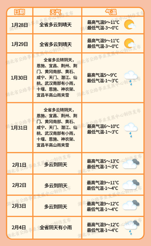 湖北省公路事業(yè)發(fā)展中心經(jīng)與省氣象服務(wù)中心會(huì)商研判,預(yù)計(jì)2025年春節(jié)期間(1月28日-2月4日),全省先晴后雨。其中,1月28日(除夕)至29日(初一),全省以多云到晴天氣為主,氣溫緩慢回升;1月30日(初二)至31日(初三)全省多云轉(zhuǎn)陰天,南部有小雨,半高山雨夾雪;2月4日(初七)陰天有小雨。請(qǐng)注意防范山區(qū)可能出現(xiàn)的雨雪天氣對(duì)交通安全的不利影響。