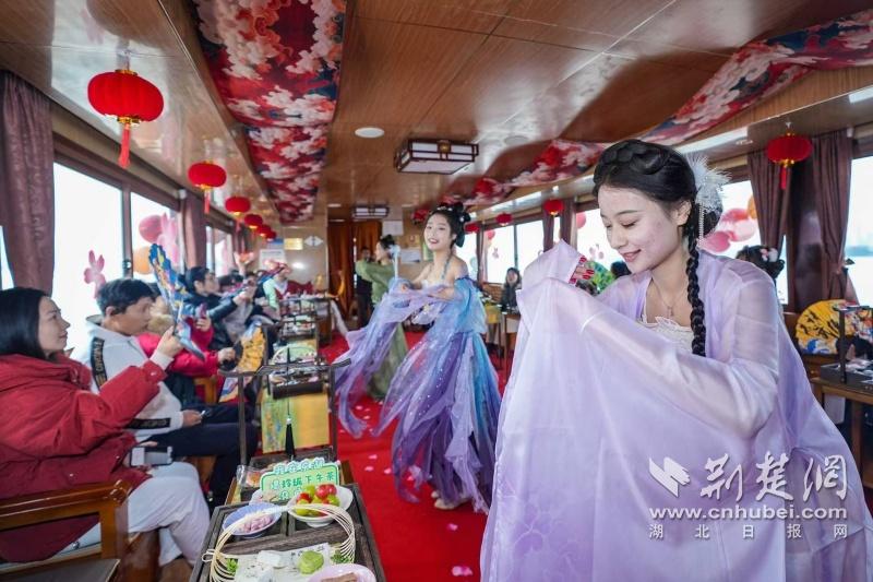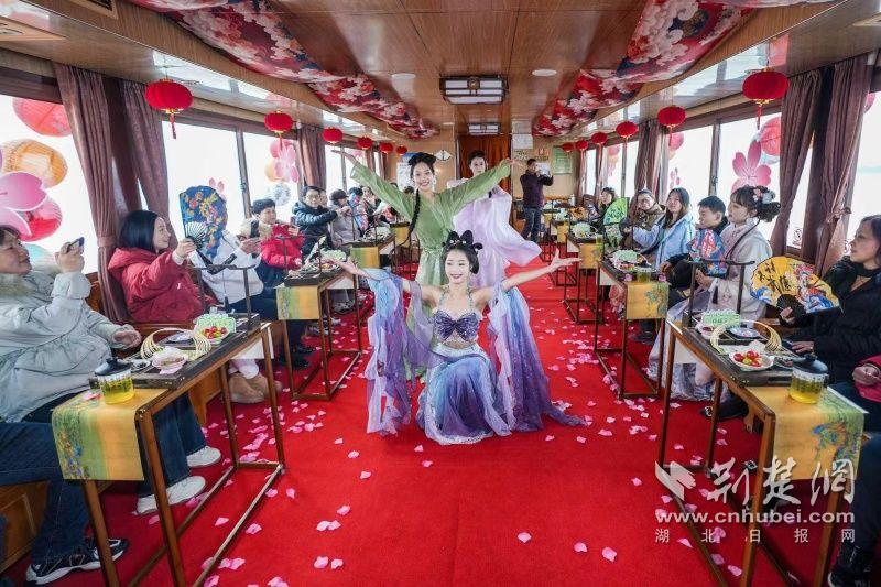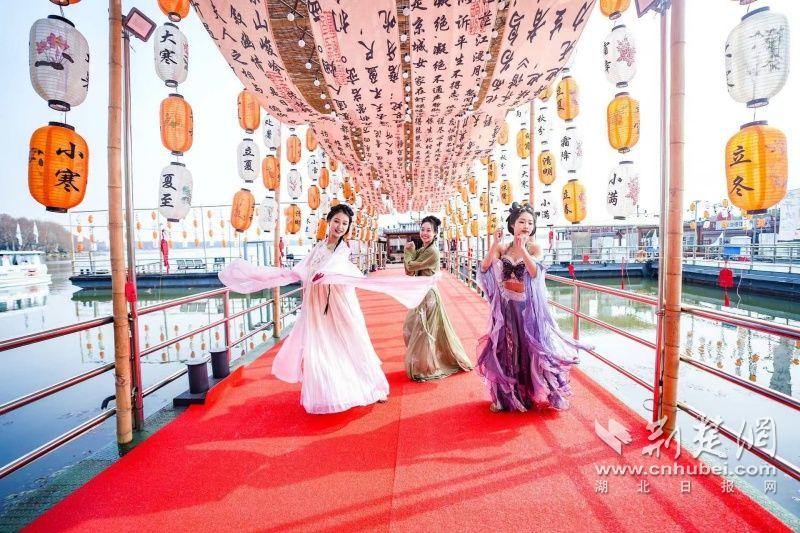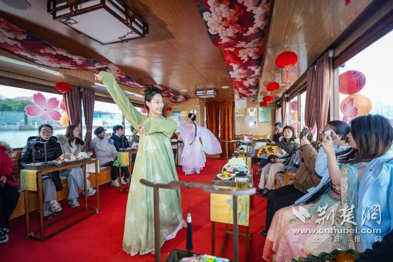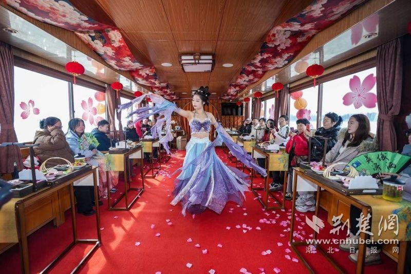 據(jù)介紹,全新上線的精品環(huán)湖游將為游客帶來沉浸式國風(fēng)演藝體驗(yàn),從楚風(fēng)園碼頭出發(fā),在游客登船之際,精彩好戲就已正式開鑼。畫舫離岸,演出開始,《元夕》《一面驚鴻》《錦瑟》等國風(fēng)舞蹈亮相甲板,表演者們霓裳蹁躚,或婉約柔美,或英氣颯爽,在游客面前隨著悠揚(yáng)楚樂,將楚舞的神韻演繹得絲絲入扣,不時(shí)還與游客隨機(jī)互動(dòng),同賀新春。