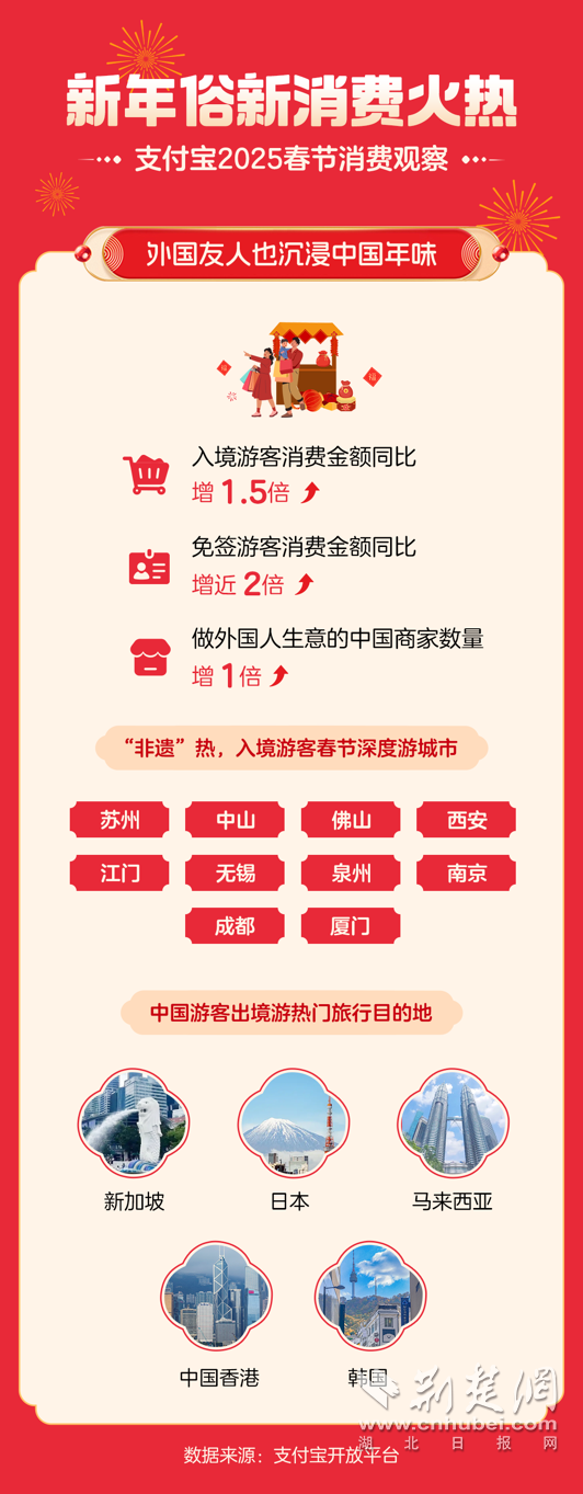 在春節(jié)成功申遺后的第一年,支付寶集福這一數(shù)字新年俗吸引了近 6 億人參與;不少外國友人也在各地感受著中國濃濃的年味,賞美景品美食,消費(fèi)熱情高漲;“南來北往”旅游過年潮已然興起,非遺體驗、冰雪景點(diǎn)游、綠色循環(huán)消費(fèi)等各種特色旅行方式層出不窮。
