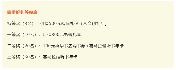 優(yōu)秀作品將獲新華書(shū)店購(gòu)書(shū)券、喜馬拉雅聽(tīng)書(shū)年卡、智能地球儀等獎(jiǎng)勵(lì),并在官方平臺(tái)展播!