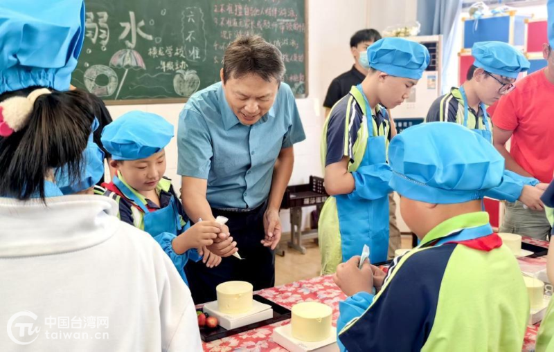 武漢臺資企業(yè)協(xié)會常務(wù)副會長兼公益委員會主委、武漢羅莎食品有限公司總經(jīng)理鄭聰評與孩子們共同體驗(yàn)蛋糕裱花。(中國臺灣網(wǎng)發(fā))
