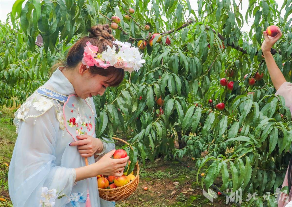 6月10日,穿著漢服的演員在采摘蜜桃。(湖北日報通訊員 陳超 攝)