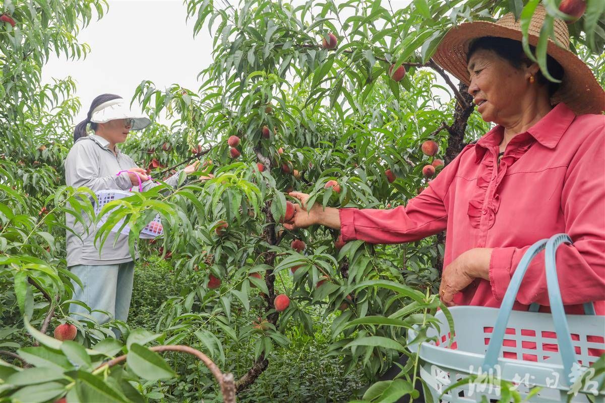 6月10日,游客在卓爾桃花驛小鎮(zhèn)采摘蜜桃。(湖北日報通訊員 陳超 攝)