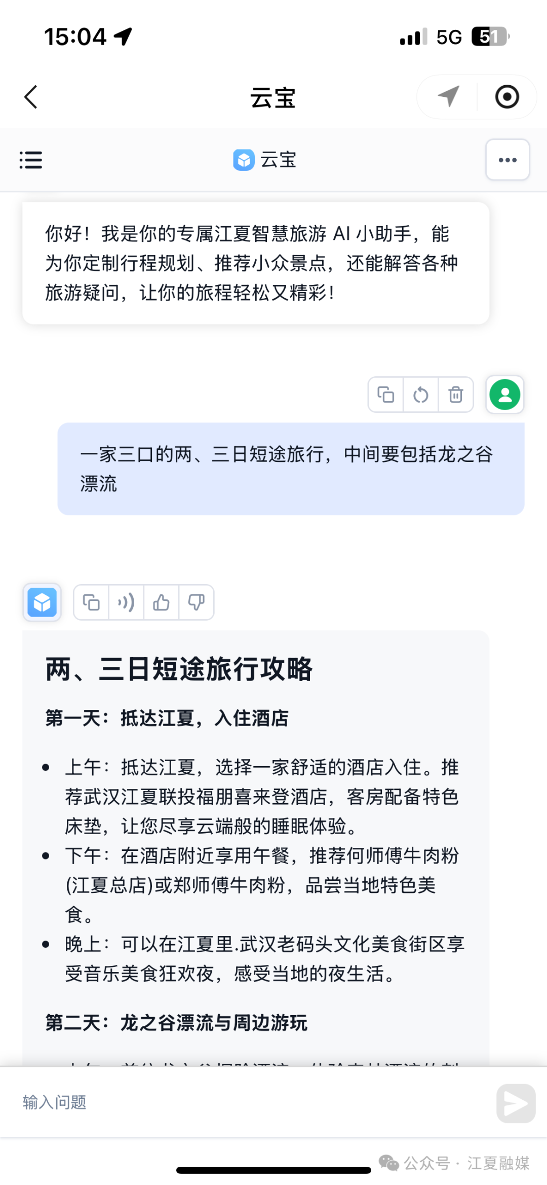 今年5月,基于騰訊元寶大模型,“云游江夏”小程序上線一款獨家AI——云寶,通過智能化技術(shù)全面升級游客體驗,同時為景區(qū)管理注入數(shù)字化活力。借助AI智能導(dǎo)游和個性化推薦功能,游客可享受定制化行程規(guī)劃;同時,AI即時應(yīng)答服務(wù)則能快速解決如查找景區(qū)信息等實用問題,大幅提升出游便利性。