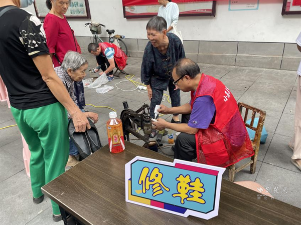 活動現(xiàn)場,磨刀、理發(fā)、修鞋等傳統(tǒng)便民服務點位前排起長隊。磨刀師傅手持磨刀石,動作嫻熟,“嚓嚓”聲中,一把把刀具煥然一新。理發(fā)師根據居民需求精心修剪發(fā)型,70歲的王大爺理完發(fā)后對著鏡子贊嘆:“手藝比理發(fā)店還好,還免費,真是方便!”修鞋攤前,師傅用專業(yè)工具修補鞋履,居民們看著修好的鞋子紛紛豎起大拇指:“這手藝,絕了!”