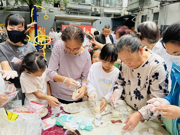 活動(dòng)現(xiàn)場(chǎng),各區(qū)域精彩紛呈?!扒墒肿鲈嘛灐弊钍菬狒[,家庭成員圍在桌前,揉面、包餡、壓模默契配合,一個(gè)個(gè)晶瑩的冰皮月餅新鮮出爐;銀杏樹上掛著百余條燈謎,“舉頭望明月(打一中藥名)”“中秋菊盛開(打一成語(yǔ))”引得居民駐足思索,不時(shí)有人喊出答案,歡呼聲此起彼伏。小朋友們也有專屬樂(lè)趣,“月滿花環(huán)”區(qū)里,用仿真花材編出中秋裝飾;“玉兔拔蘿卜”游戲中,你追我趕比拼速度,歡笑聲此起彼伏。