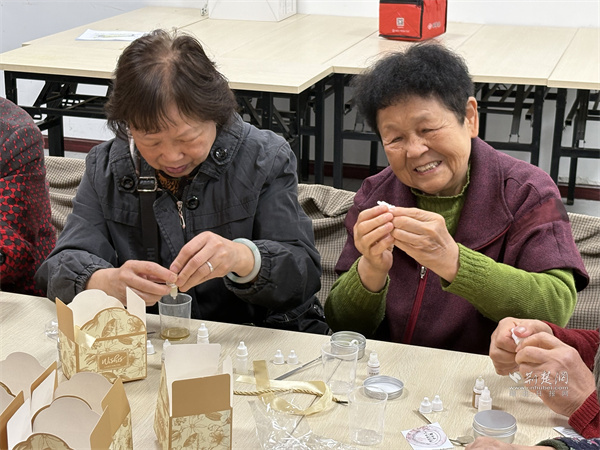 在大歌笛湖小區(qū)鄰里客廳內(nèi)熱鬧非凡,水拓扎染絲巾的制作現(xiàn)場,老人們按照工作人員講解的步驟興致勃勃地動手實踐,讓一幅幅色彩斑斕、花紋各異的絲巾作品逐漸成型,老人們拿著自己親手制作的絲巾,成就感滿滿。天然蜂蠟護手霜DIY環(huán)節(jié),大家按照配比將蜂蠟、橄欖油等材料混合加熱、攪拌、裝罐,制作出天然無添加的護手霜,既實用又健康。鄰里客廳外的便民服務(wù)也同步貼心上線,免費理發(fā)、血壓測量、法律咨詢等服務(wù),切實幫助老年人解決實際需求,讓“笛韻”成為串聯(lián)健康、睦鄰、便利生活的“銀齡生活協(xié)奏曲”,串聯(lián)起銀齡幸福生活。