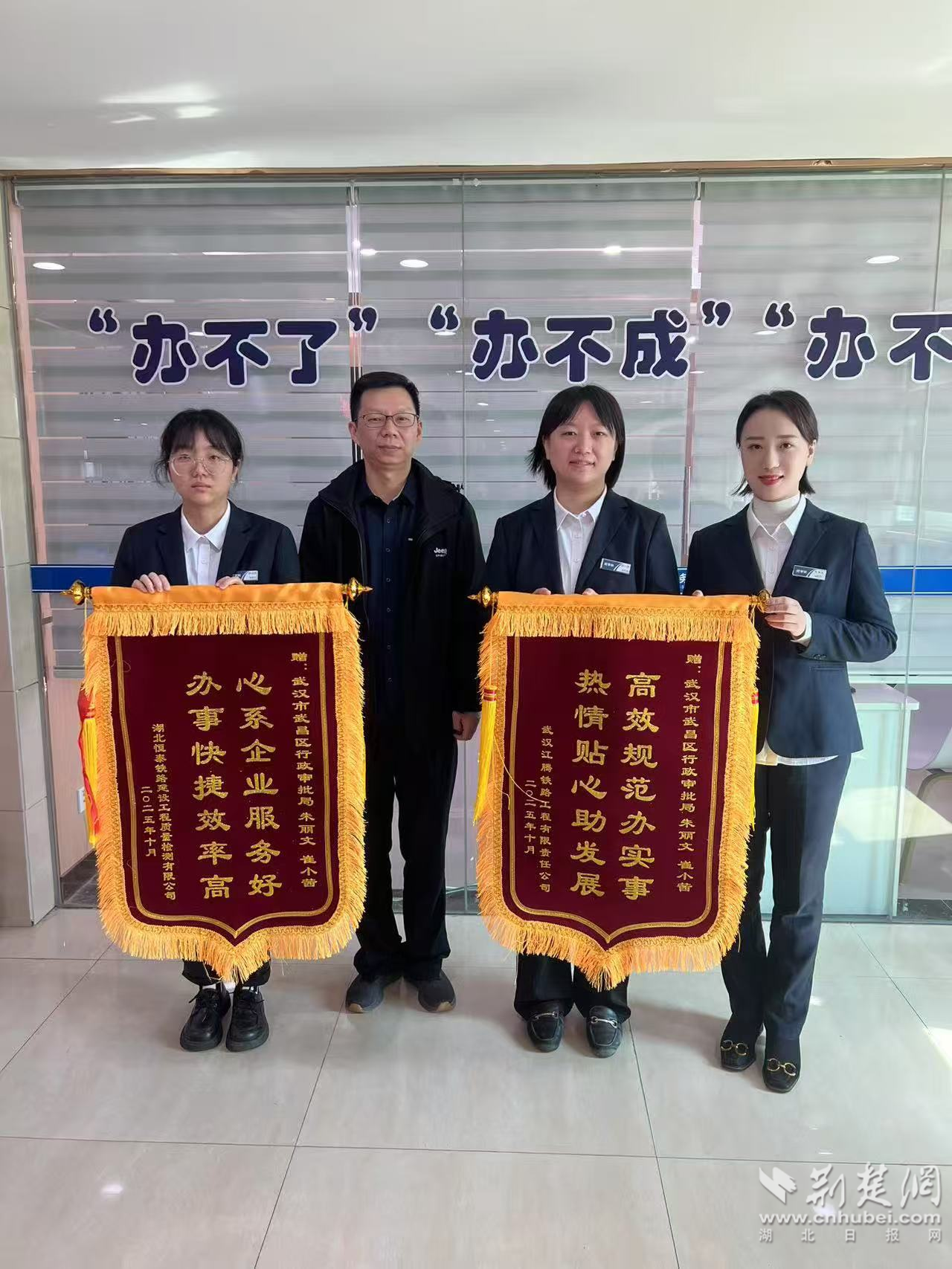 荊楚網(wǎng)(湖北日?qǐng)?bào)網(wǎng))訊(記者 李燕 通訊員 李永波 王金丹)10月24日,中國(guó)鐵路武漢局集團(tuán)旗下湖北恒泰鐵路建設(shè)工程質(zhì)量檢測(cè)有限公司、武漢江騰鐵路工程有限責(zé)任公司,順利辦結(jié)業(yè)務(wù)變更手續(xù)后,經(jīng)辦人董先生專程送來2面錦旗,向武昌區(qū)行政審批局工作人員表達(dá)謝意。