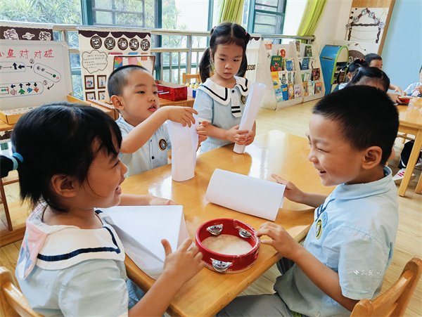動手環(huán)節(jié)點燃孩子們的熱情,四人一組的小隊伍里,小朋友們手握A4紙、膠帶躍躍欲試,有的反復卷緊紙張,力求讓紙筒更厚實;有的湊著腦袋和伙伴商量,給紙筒底部貼“小支架”增強穩(wěn)定性。課堂里,剪刀裁剪聲、膠帶粘貼聲伴著小聲討論,專注的小身影構成了熱鬧又溫馨的畫面。