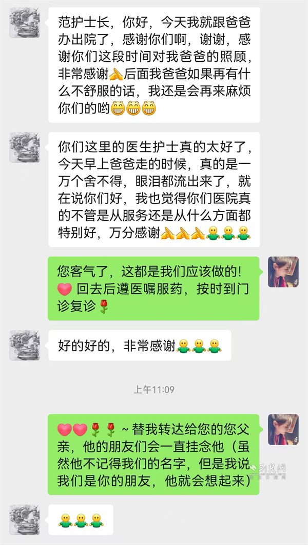 這份細(xì)致關(guān)懷,也深深印在患者和家屬心里。患者蔡爹爹出院前,女兒特意給副護(hù)士長(zhǎng)范美玲發(fā)來(lái)微信:“你們這里的醫(yī)生護(hù)士真是太好了,爸爸在這住得比家里還舒心,你們比親人還細(xì)心。今天早上離開(kāi)的時(shí)候,他一萬(wàn)個(gè)舍不得,反復(fù)念叨著不想走。”