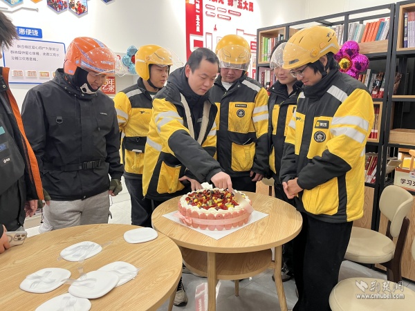 活動現(xiàn)場洋溢著濃濃的溫情。驛站內(nèi),“生日快樂”的主題裝飾錯落擺放,工作人員還精心準(zhǔn)備了定制生日蛋糕、可愛的生日帽,將小小的驛站裝點(diǎn)成充滿歡笑的“生日之家”。伴隨著熟悉的《生日快樂》旋律響起,外賣騎手、環(huán)衛(wèi)師傅們圍在一起,共同吹滅蠟燭、許下心愿,分享這份屬于他們的甜蜜與喜悅。