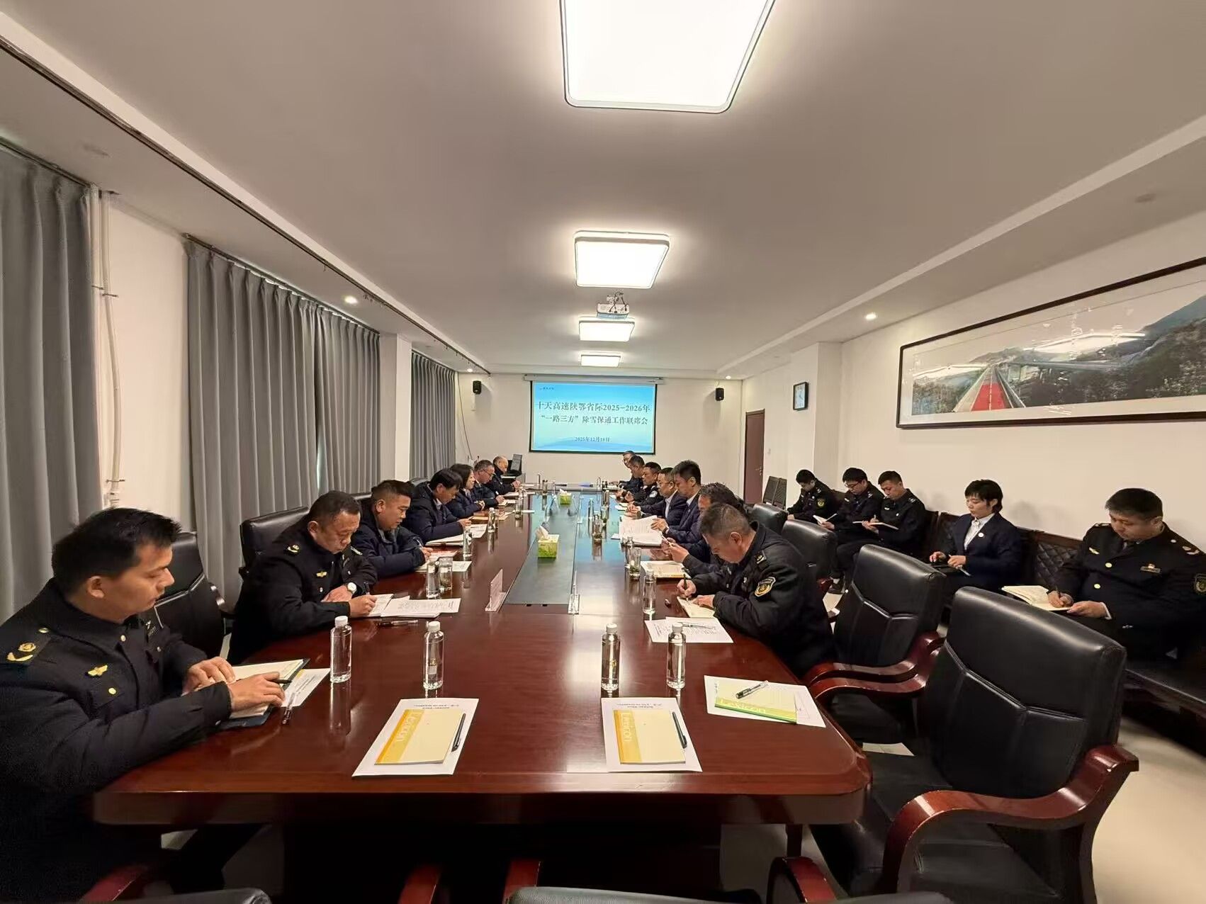 聯(lián)動(dòng)座談前,省際“一路三方”各單位現(xiàn)場(chǎng)觀摩了除雪防滑應(yīng)急演練,實(shí)戰(zhàn)檢驗(yàn)預(yù)案可行性與機(jī)制運(yùn)行效果,并共同簽訂《十天高速公路陜鄂省際路段“一路三方”跨省聯(lián)勤聯(lián)動(dòng)協(xié)作協(xié)議》,明確惡劣天氣分級(jí)處置流程與省際共管路段責(zé)任分工,推動(dòng)形成“上下聯(lián)動(dòng)、左右協(xié)同、全域覆蓋”的區(qū)域應(yīng)急保障格局。