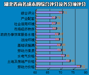 投資者對(duì)影響我省商務(wù)成本的十大因素的評(píng)價(jià)都較均衡,各項(xiàng)評(píng)分介于67.8-77之間,綜合評(píng)分70.51,正好位于基本滿意(60)與滿意(80)區(qū)間的中位。較去年同類調(diào)查數(shù)據(jù)相比,提高3.5分。 ……………………………………………………………………