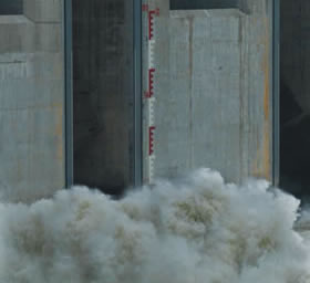 6月1日上午9時整,壩后右岸第3孔下閘前情景。