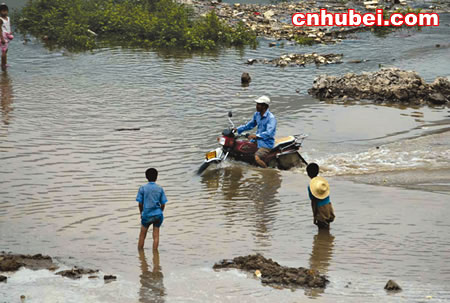 依斗門碼頭110米水位下的房子已沒入江中一半。