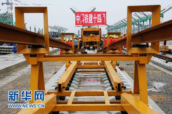 資料圖片:7月17日,中國(guó)鐵建十四局集團(tuán)京滬高鐵鋪軌工班的工人們正在鋪設(shè)通道,為正式鋪軌進(jìn)行準(zhǔn)備。京滬高鐵先導(dǎo)試驗(yàn)段北段將于7月19日開始率先從徐州向蚌埠鋪軌,南段將于8月中旬從南京向蚌埠鋪軌,10月底將完成試驗(yàn)段鋪軌。京滬高速鐵路全長(zhǎng)1318公里,全線縱貫京津滬三大直轄市和河北、山東、安徽、江蘇四省,是我國(guó)目前最長(zhǎng)的客運(yùn)專線之一。新華社發(fā)(劉文攝)